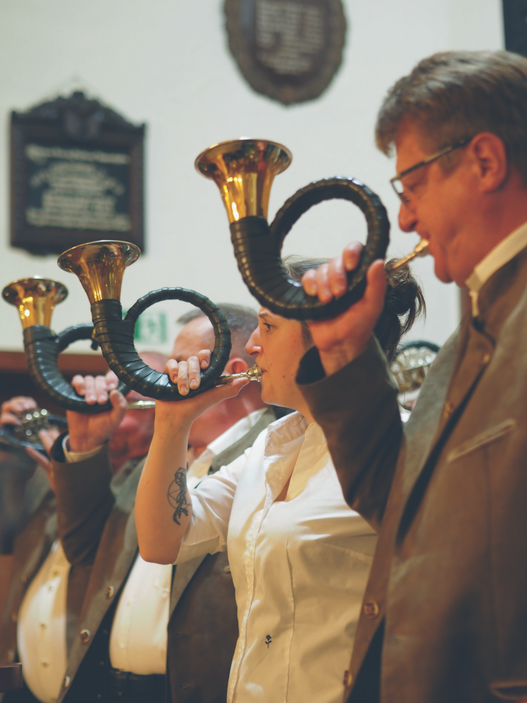 Unsere Bläsergruppe ist ein fröhlich-harmonisches Ensemble aus rund 17 aktiven Bläserinnen und Bläsern, das mit großer Leidenschaft die Klänge von Fürst-Pless- und Parforcehörnern in B erklingen lässt.